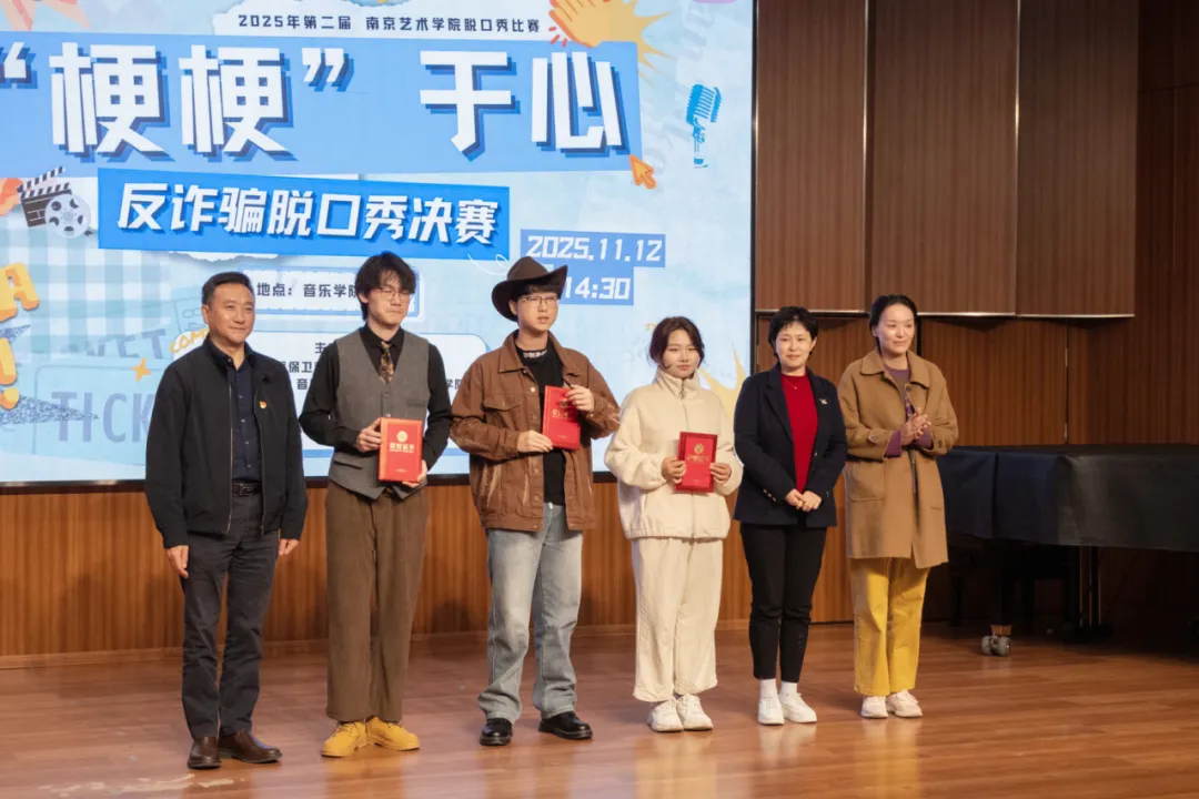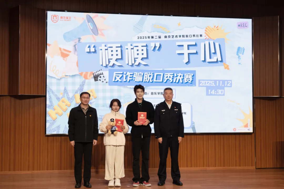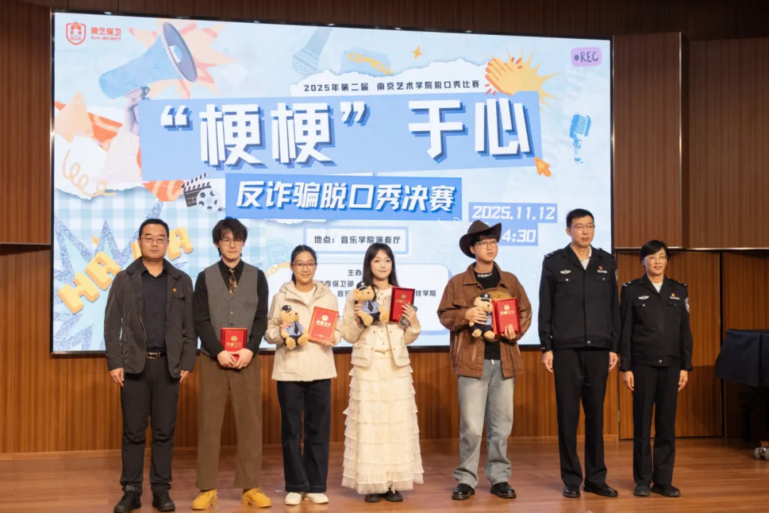 11月12日下午,由南京艺术学院党委保卫部、党委学工部、戏剧与影视学院、音乐学院、现代音乐与科技学院联合主办,南京艺术学院大学生安全协会承办的第二届“梗梗”于心反诈脱口秀决赛在音乐学院演奏厅顺利开展并圆满落幕。八强战队历经多轮激烈角逐脱颖而出,在决赛舞台上以“拆骗”为主题,通过幽默有趣的脱口秀形式传递识骗、防骗、拆骗技巧,为现场观众带来一场兼具趣味性与实用性的反诈视听盛宴。